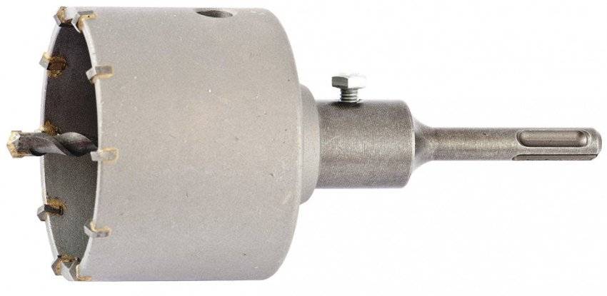 В таких работах нам поможет коронка для перфоратора, основное предназначение которой — проделывать именно большие диаметры отверстий в кирпиче и бетоне.