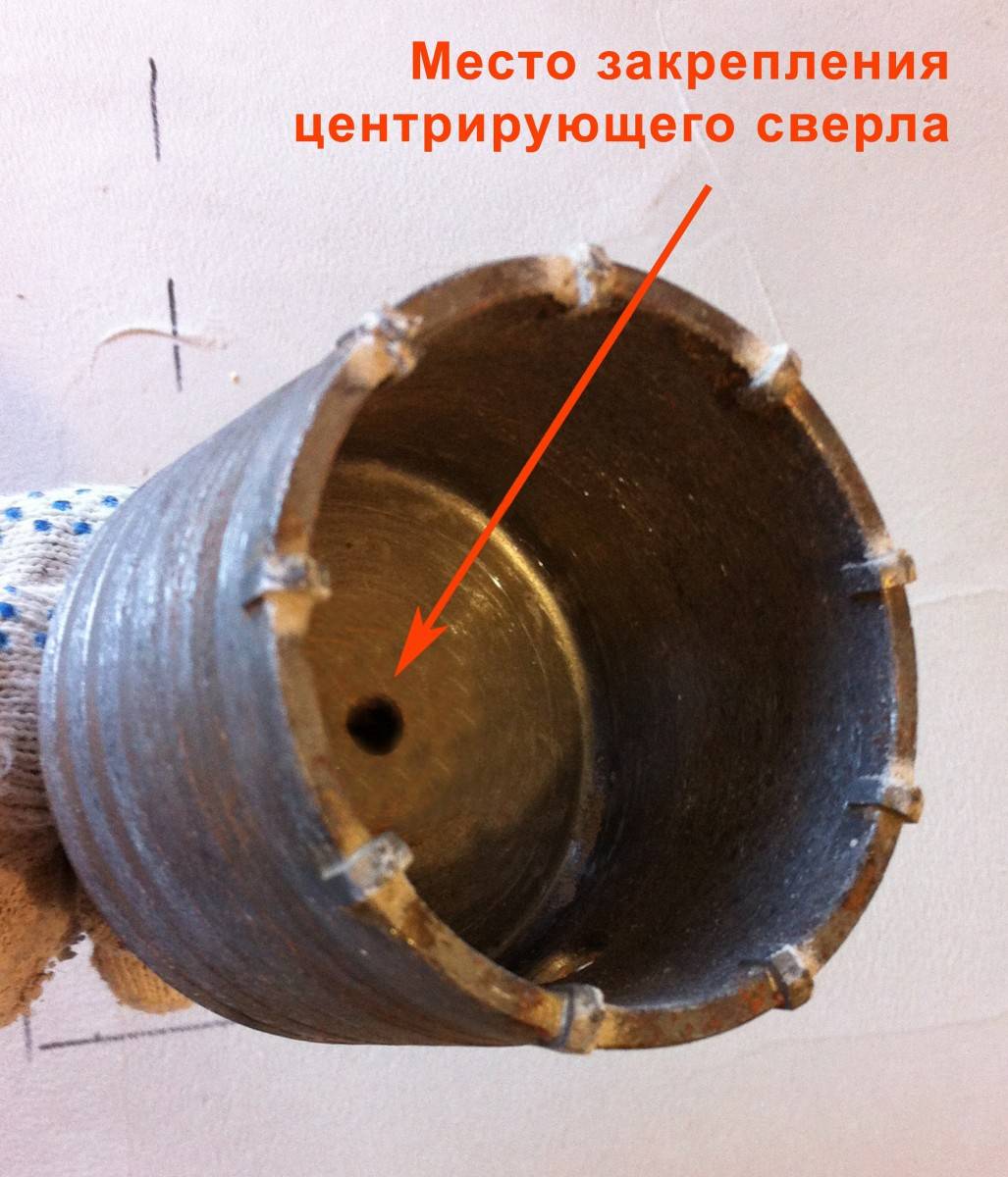 Перед началом работы нужно убедиться, что в месте сверления отсутствует арматура, которая может повредить коронку. При наличии центрирующего сверла, приставляем его в точку, соответствующую центру будущего отверстия и начинаем сверлить. Если коронка без центрирующего сверла, то нужно приложить её режущую кромку к поверхности стены всеми зубьями одновременно.