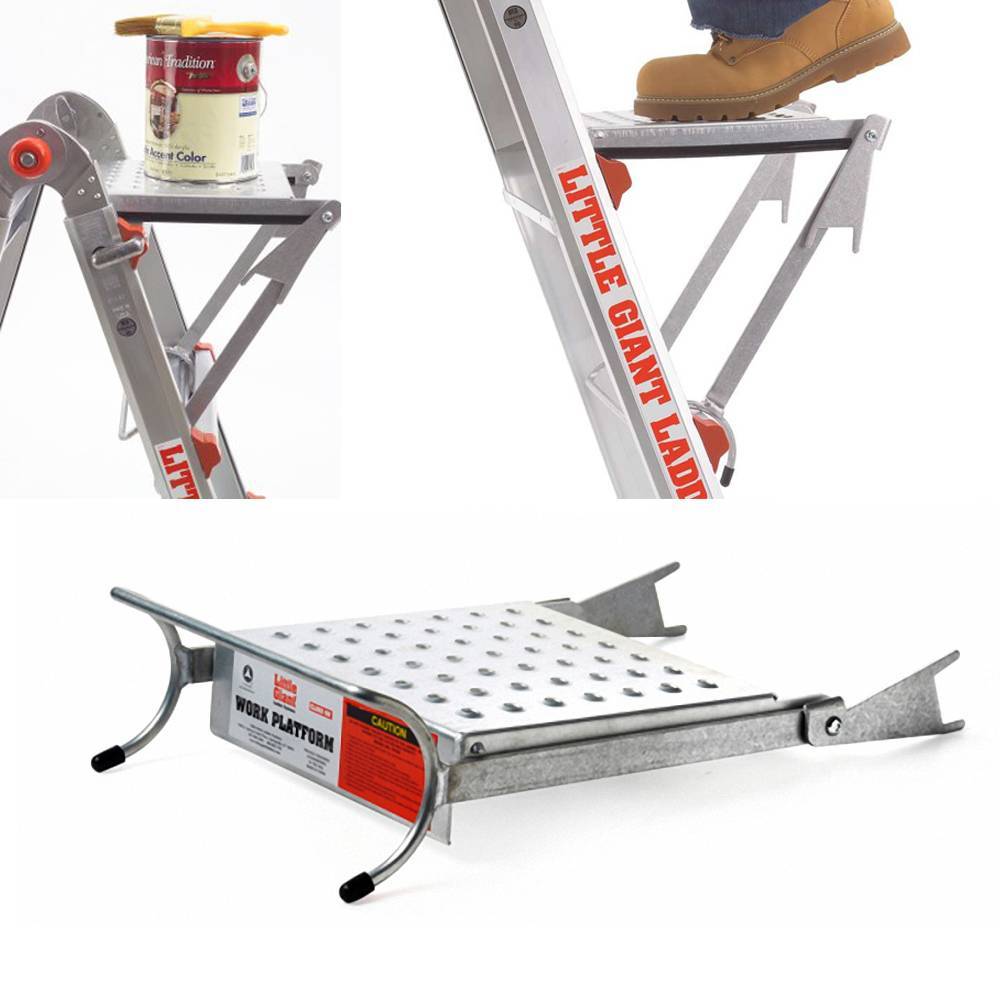 На опорной лестничной конструкции при желании может быть установлена площадка, облегчающая проведение работ. В таком случае можно с легкостью проводить работы, например, на потолке.