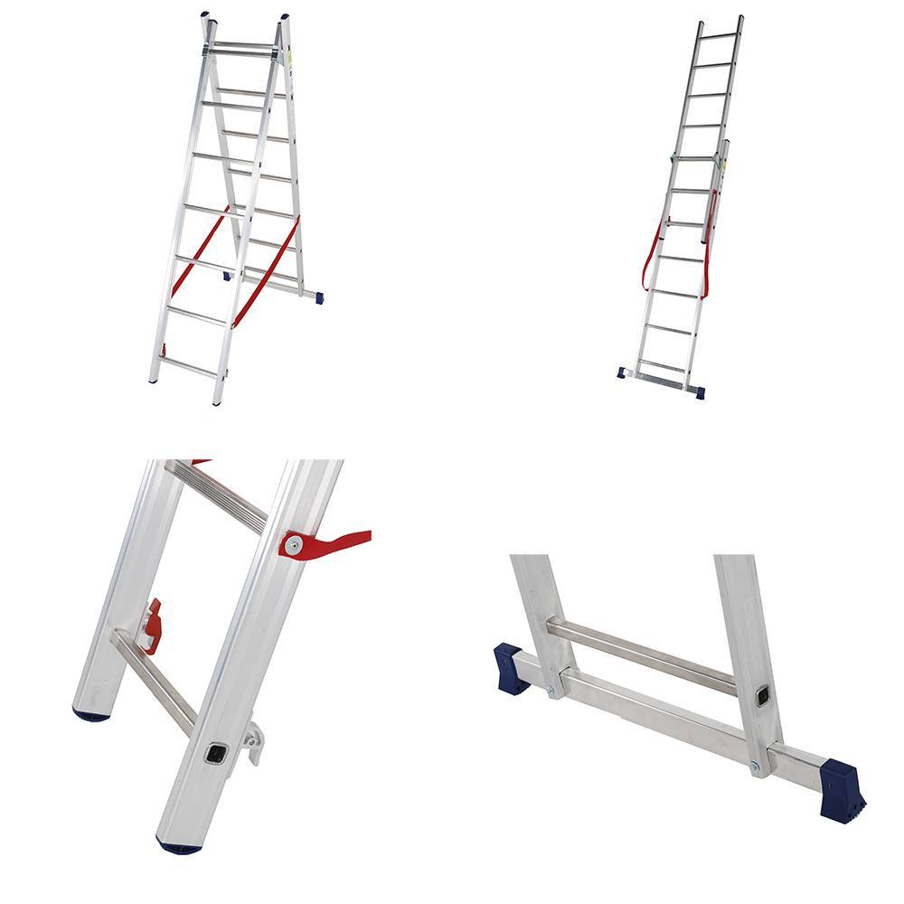 Лестница двухсекционная шарнирная – конструкция универсальна и может применяться в качестве двусторонней стремянки и как приставное приспособление. Фрагменты лестницы алюминиевой складной соединены между собой шарнирными устройствами, автоматически фиксирующими положение устройства. Рабочая высота шарнирных устройств варьирует от 2,90 м до 7,43 м при длине лестничного полотна 1,90 – 6.75 м. Возвышение стремянки при длине секции 2,76 м будет достигать 2,70 м. Вес такой конструкции не превышает 16,15 кг.