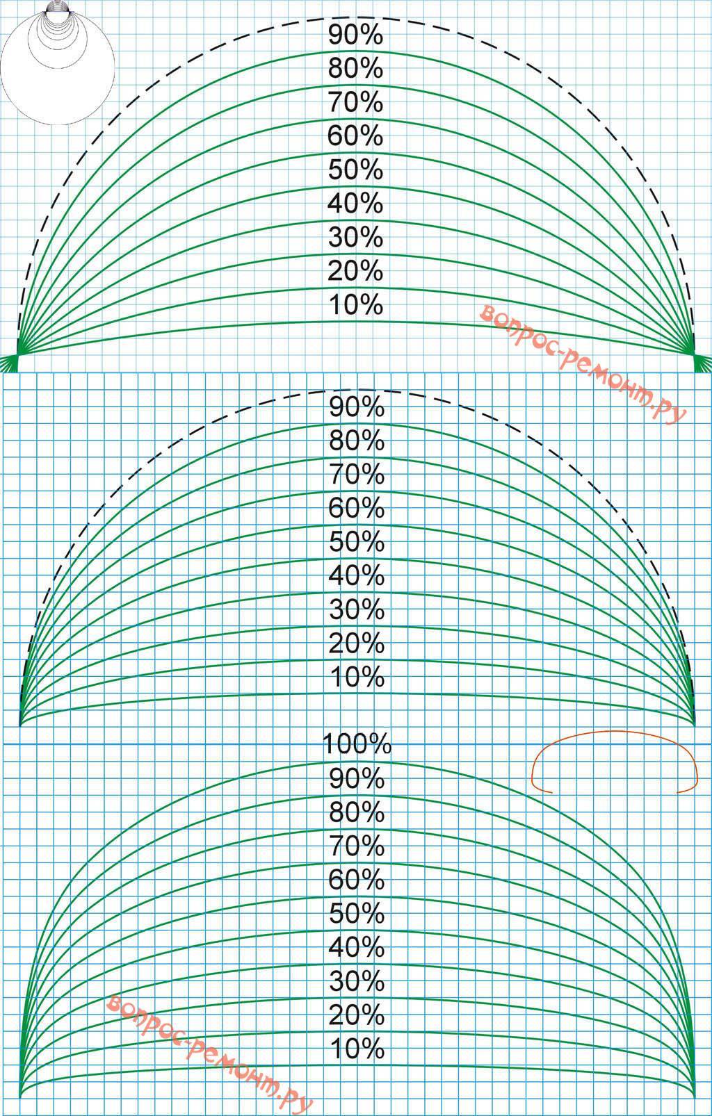 Контур полуциркульной арки размечают при раскрое материала, как известно, самодельным циркулем из рейки или куска профиля с ввинченными по краям саморезами. Но при разметке сегментной арки радиус образующей окружности стремительно нарастает с уменьшением ее стрелы, что особенно актуально при низких потолках. Если кто-то и сделает реечный циркуль с плечом в 5, а то и 15 м, то как им пользоваться? Равно как и строить по формулам дугу эллипса или сложной кривой персидской (модерновой) арки. На такой случай на рис. даны чертежи семейств образующих кривых сегментных (вверху), эллипсных (в середине) и персидских (внизу), по которым может быть построена декоративная арка различной глубины, т.е. относительной величины стрелы: за ее 100% принято отношение пролета к стреле, равное 2, как у полуциркульной арки. При аккуратном переносе по клеточкам строительная точность в 3 мм на 1 м длины соблюдается до пролета в 3-4 м.