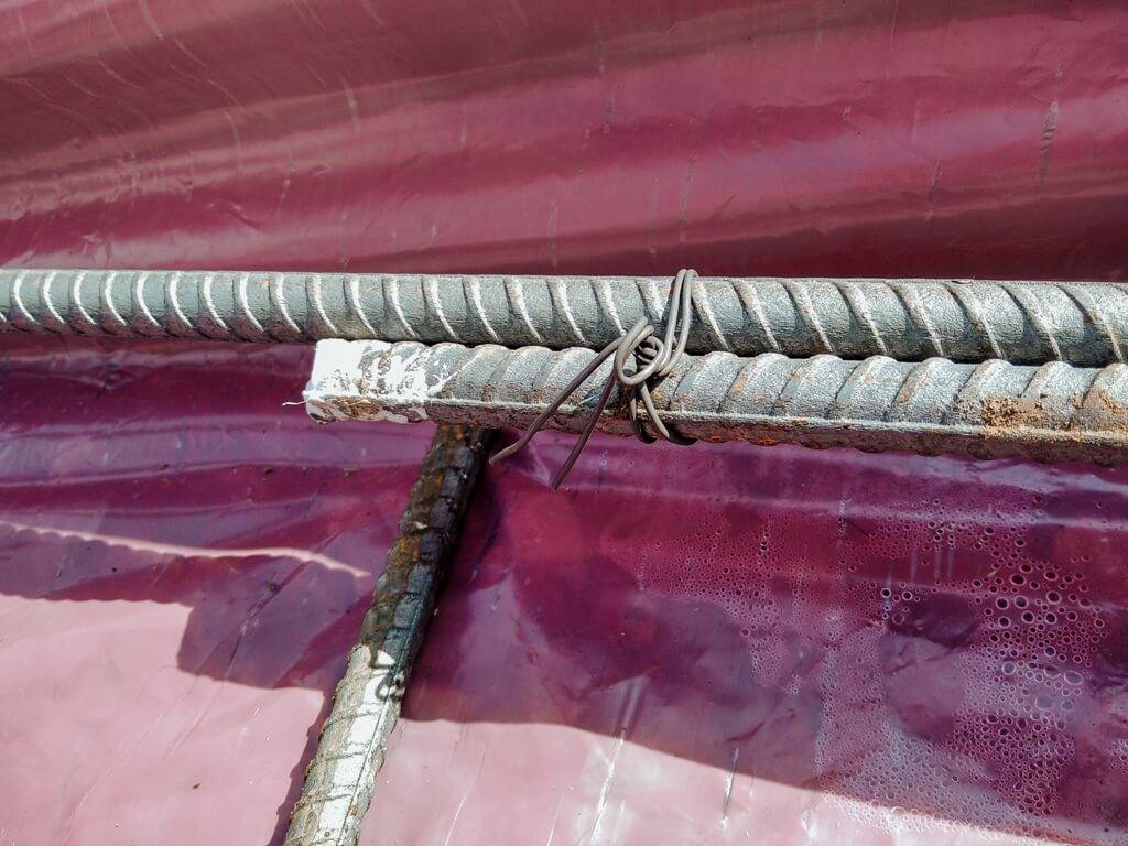 - Раскладываем 1 слой арматуры. При нехватке одно целого прута стыкуем их, но следует помнить о правиле, что соседние пруты не соединяются в одном месте, следует сделать разбежку между арматурами. Размер нахлеста 42 диаметра арматуры.