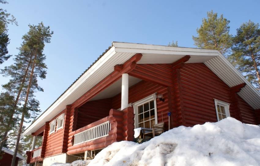 Необходимо установить мелкозагубленный ленточный фундамент. Есть вариант и винтовых свай. Чтобы защитить бревно от намокания, требуется вентиляция фундамента. Для этого продухи ставят со всех сторон, а в холодное время года их закрывают. Не стоит экономить на свесах кровли. Чем выше будет строение, тем длиннее нужны свесы.