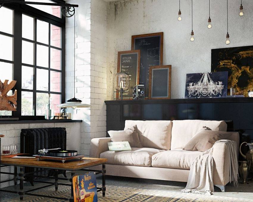Хорошим фото-примером такого оформления может стать гостиная в стиле лофт, где стена из белого кирпича в интерьере (с книжными полками) как нельзя лучше делает акцент на данном направлении.