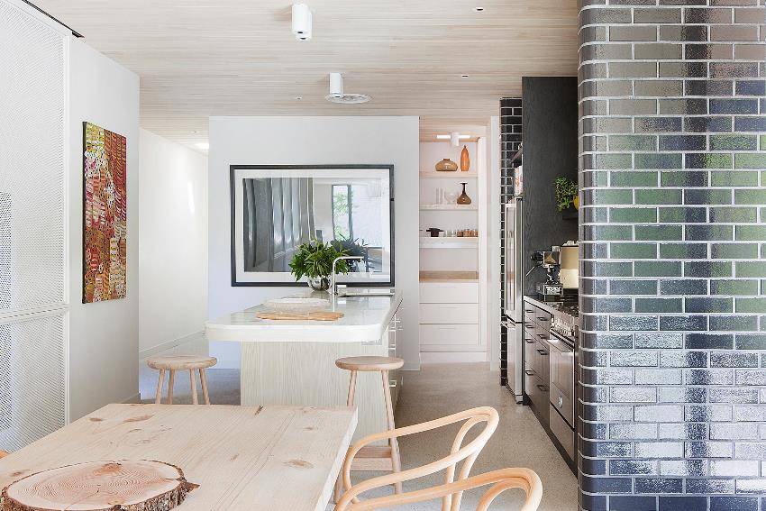 На фотографии вы видите белую кирпичную стену в кухне-гостиной. Проект BohoStudio «Интерьер квартиры 56 м2».