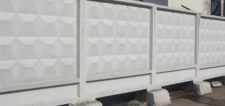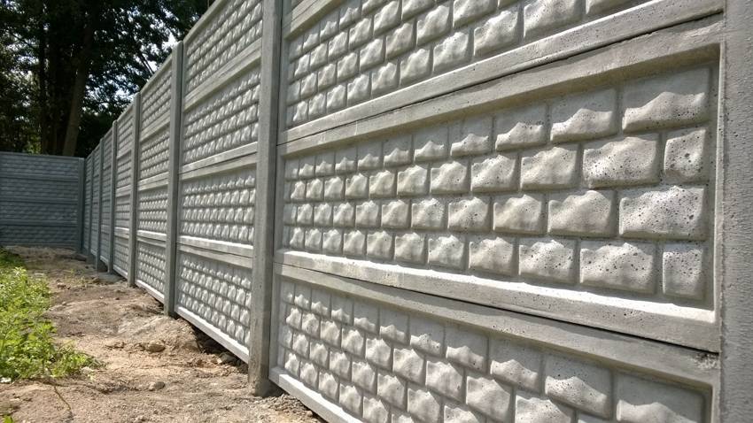 Такие ограждения производятся из тяжелых бетонов и стальной арматуры. Это делает ограду устойчивой к температурным перепадам, растяжению и сжимающим нагрузкам. Под такое сооружение не требуется сплошной фундамент, как под кирпичные заборы. Кроме того бетонные плиты: