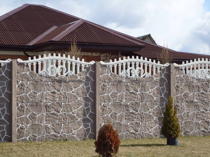 Декорированные таким образом ограждения не теряют преимуществ бетонной конструкции.