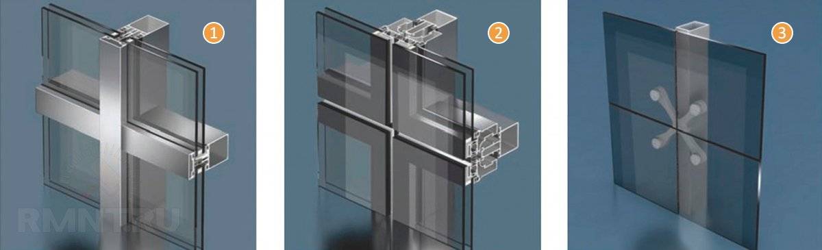 Системы крепления фронтального остекления: 1 — стоечно-ригельная; 2 — структурная; 3 — система «спайдер»