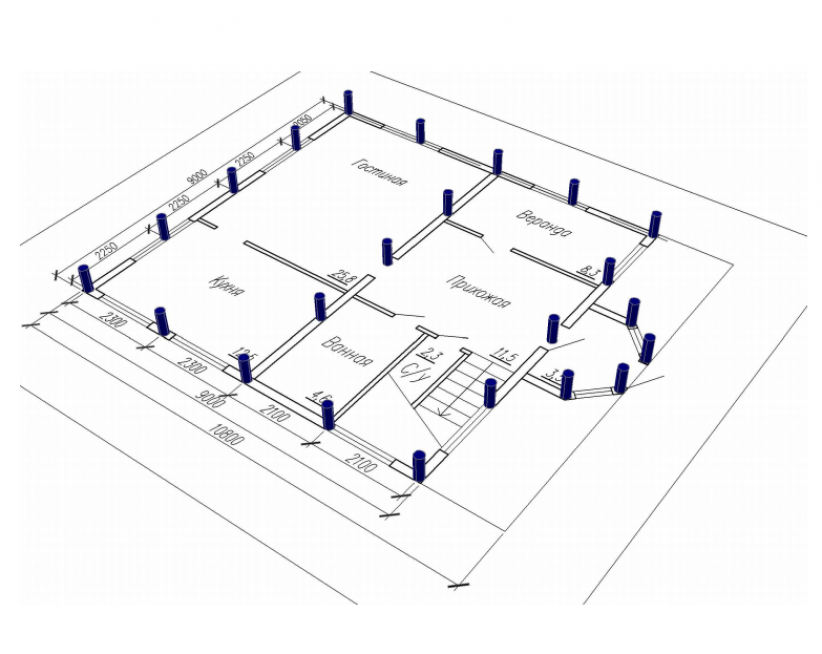 Монтировать основание под дом нужно по предварительно составленной схеме, в основе которой лежит СНиП, требующий выполнения таких правил: сваи должны быть в углах здания, вдоль несущих стен и под входной группой.
