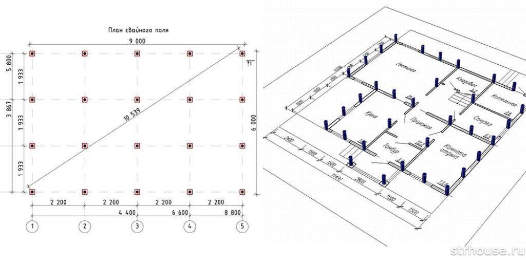 Монтировать основание под дом нужно по предварительно составленной схеме, в основе которой лежит СНиП, требующий выполнения таких правил: сваи должны быть в углах здания, вдоль несущих стен и под входной группой.