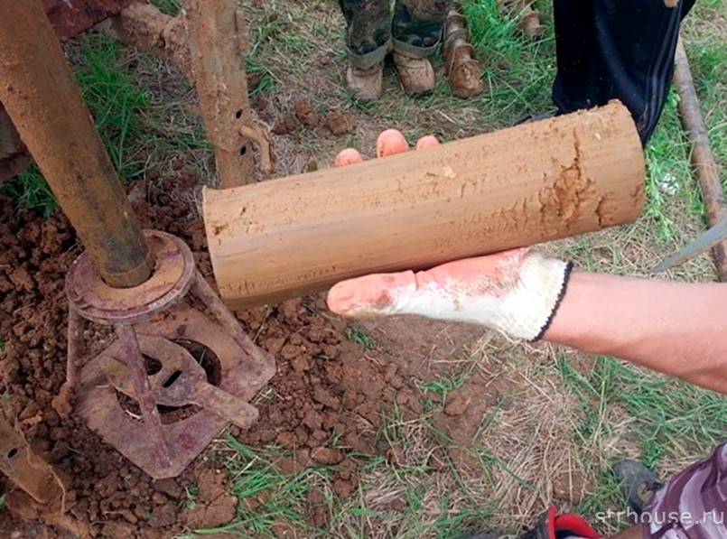 Бурение проводится ручным буром, который заглубляется на нужную глубину. При проходке грунт не выбрасывается на поверхность, уплотняясь по стенкам.