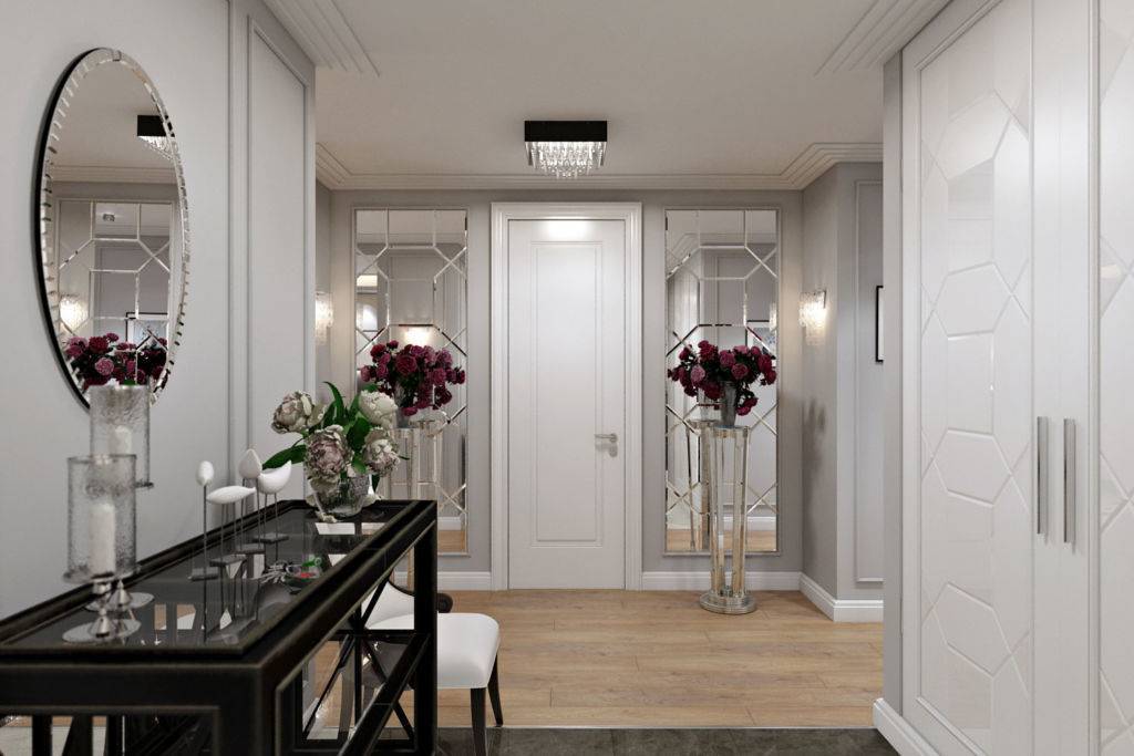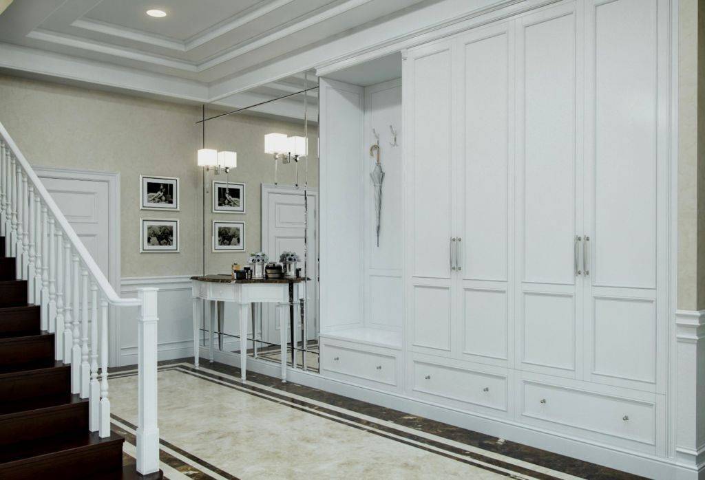 Классическая прихожая белого цвета с тумбой и зеркалами