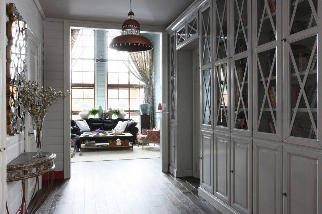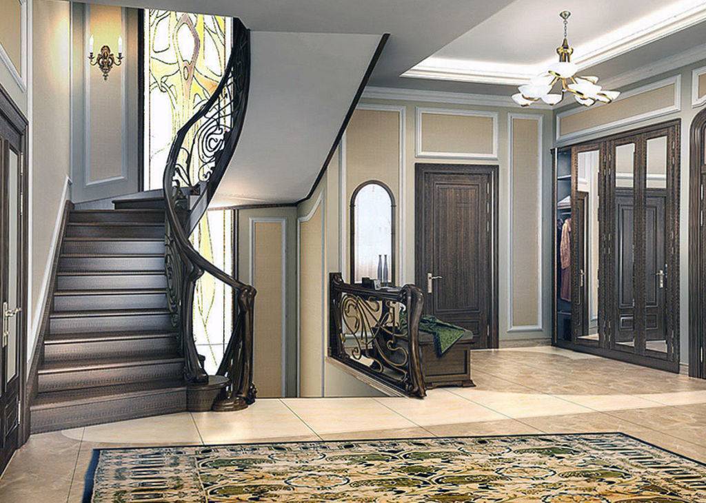 Владельцы коттеджей и деревянных домов, желая подчеркнуть свое общественное положение, для отделки своих загородных строений выбирают классический стиль. Коридор оформляют в пастельных тонах с элементами насыщенных оттенков. Для акцентирования внимания в помещении размещают аксессуары, ковры и занавески ярких расцветок.