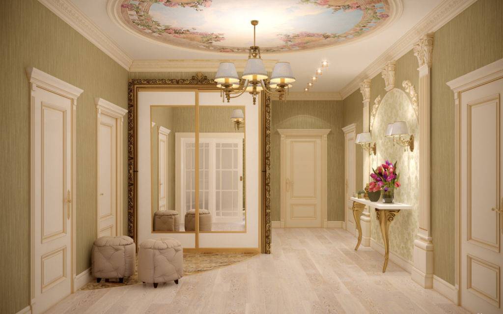 Классическое оформление. Для отделки маленькой прихожей этот стиль подходит больше других. Для увеличения пространства потолок выкрашивают в белый цвет, а стены оформляют в разной цветовой гамме. Такое оформление будет хорошо смотреться и в большой прихожей.