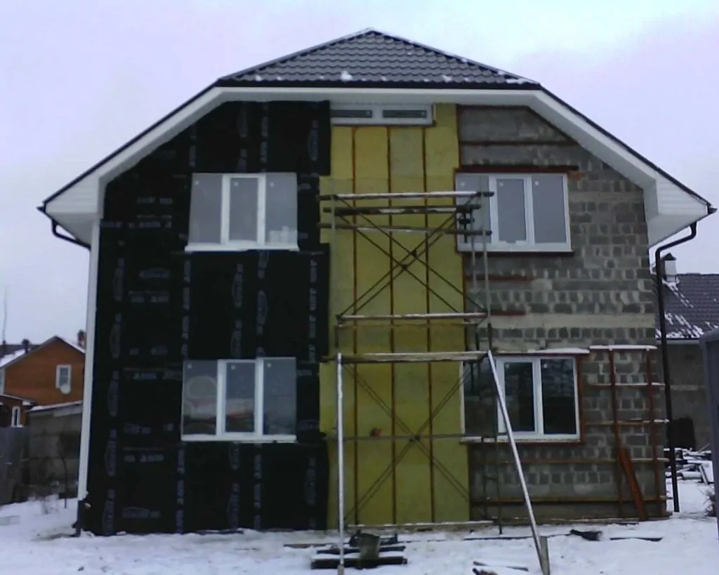 Что касается толщины утеплителя, то использовать плиты менее 50 мм толщиной в российских регионах с суровыми климатическими условиями, сильными ветрами и резкими перепадами температур не имеет смысла. Оптимальный вариант — 100 мм при толщине несущей стены из блоков в 300-400 мм.
