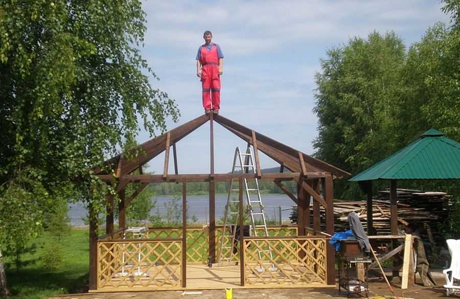 Во время монтажа стропильных ног в центре беседки устанавливают временную подпорку-стойку, которая удаляется после изготовления крыши.