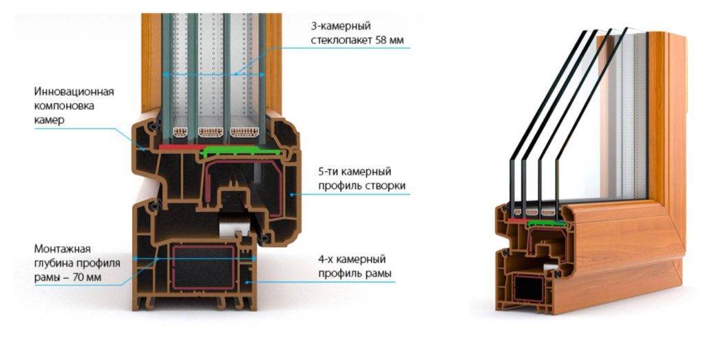 Ширина пятикамерной модели варьируется в пределах 68-70 мм. Толщина отсека со стеклами – до 40 мм. Даже у самого сложного трехкамерного окна параметры не превышают 62 мм, а секции – до 32 мм. Уровень теплоизоляции первых конструкций – 0,56 м2*К/ВТ, у вторых – всего 0,53.