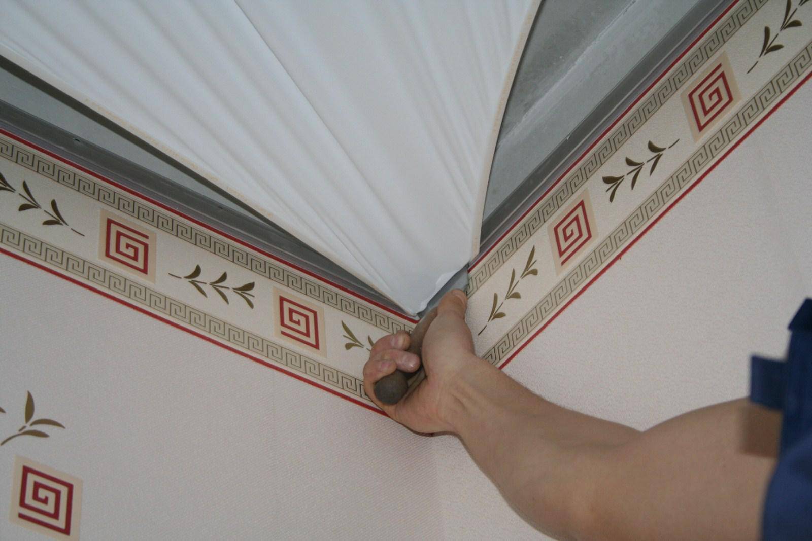 Для начала рассматривают стандартное выполнение, при котором полотно внатяжку крепят к профилю. В случае, если устанавливают верхнее полотно, а затем клеят шпалеры, риск испачкать ткань высока, ведь их подтягивают на достаточную высоту. Вывод прост: начинают с боков, постепенно переходя к кровле.