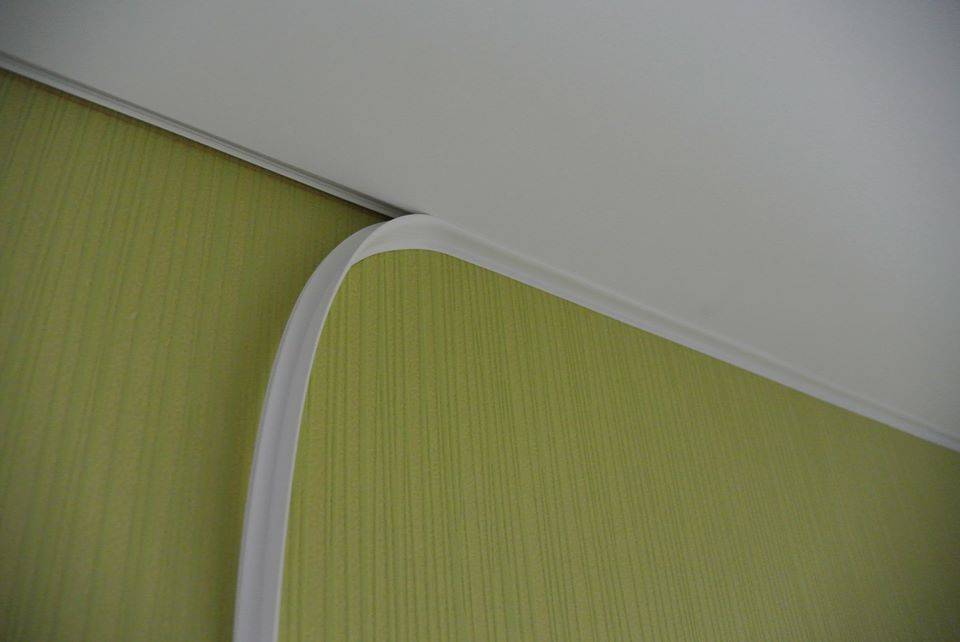 Представим себе, что мы будем натягивать ПВХ по всему периметру, то есть, это будет ровное сплошное полотно, которое будет крепиться непосредственно к стенам, как фото вверху, где прикручивается монтажный профиль.