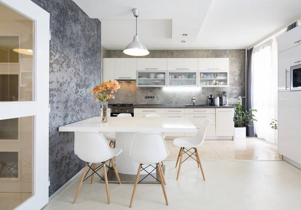 Текстурную краску можно использовать для оформления акцентной стены в кухне или кухне-столовой. Можно оформить только одну стену, которая находится далеко от рабочей зоны кухни. Нежелательно использовать ее для отделки фартука, так как отмывать рельефное покрытие сложнее. Исключение – если закрыть ее в последующем декоративным стеклом. Например, так можно оформить фартук под бетон и, чтобы было удобно мыть, заказать скинали из прозрачного закалённого стекла.