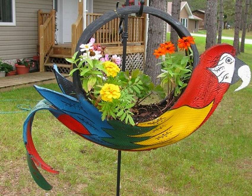 Одним из самых интересных и красивых вариантов вазонов для цветов из покрышек является подвесное кашпо в виде попугая. Попробовать смастерить его можно по следующей инструкции:
