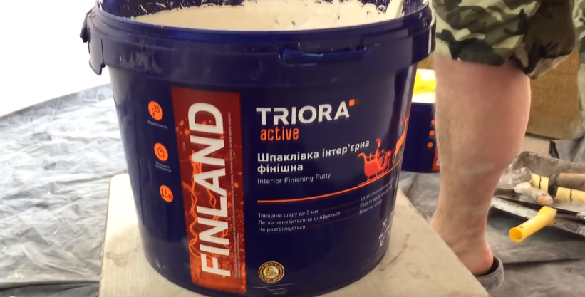 - Шпатлевку готовят, согласно инструкции на упаковке. Если взято две разновидности сухих смесей, их смешивают друг с другом в равных пропорциях, добавляют воду и тщательно перемешивают. По консистенции раствор должен напоминать сметану (и не жидкий, и не густой).