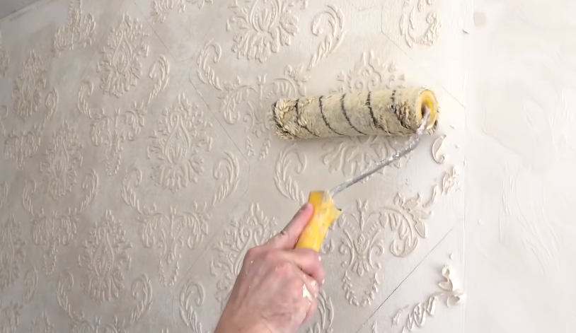 - Завершающий этап – покраска в выбранный цвет. Валиком прокатываем колер по поверхности, без нажима, инструмент должен закрасить только выступающий рельеф.