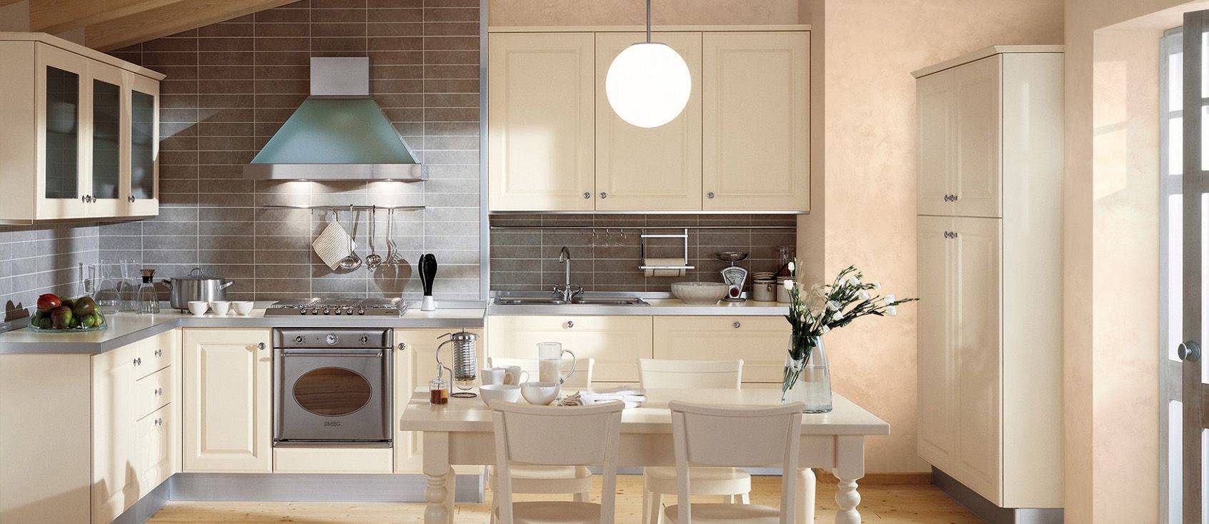 Двухрядная классическая белая кухня с отделкой из материала в бежевых тонах