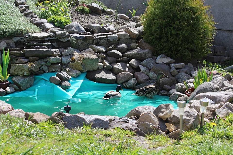 Декорируют водоем любым выбранным способом. Зная, как выкопать яму для искусственного водоема, ее прикрывают любым подручным материалом – старые баннеры в качестве подложки подходят идеально.