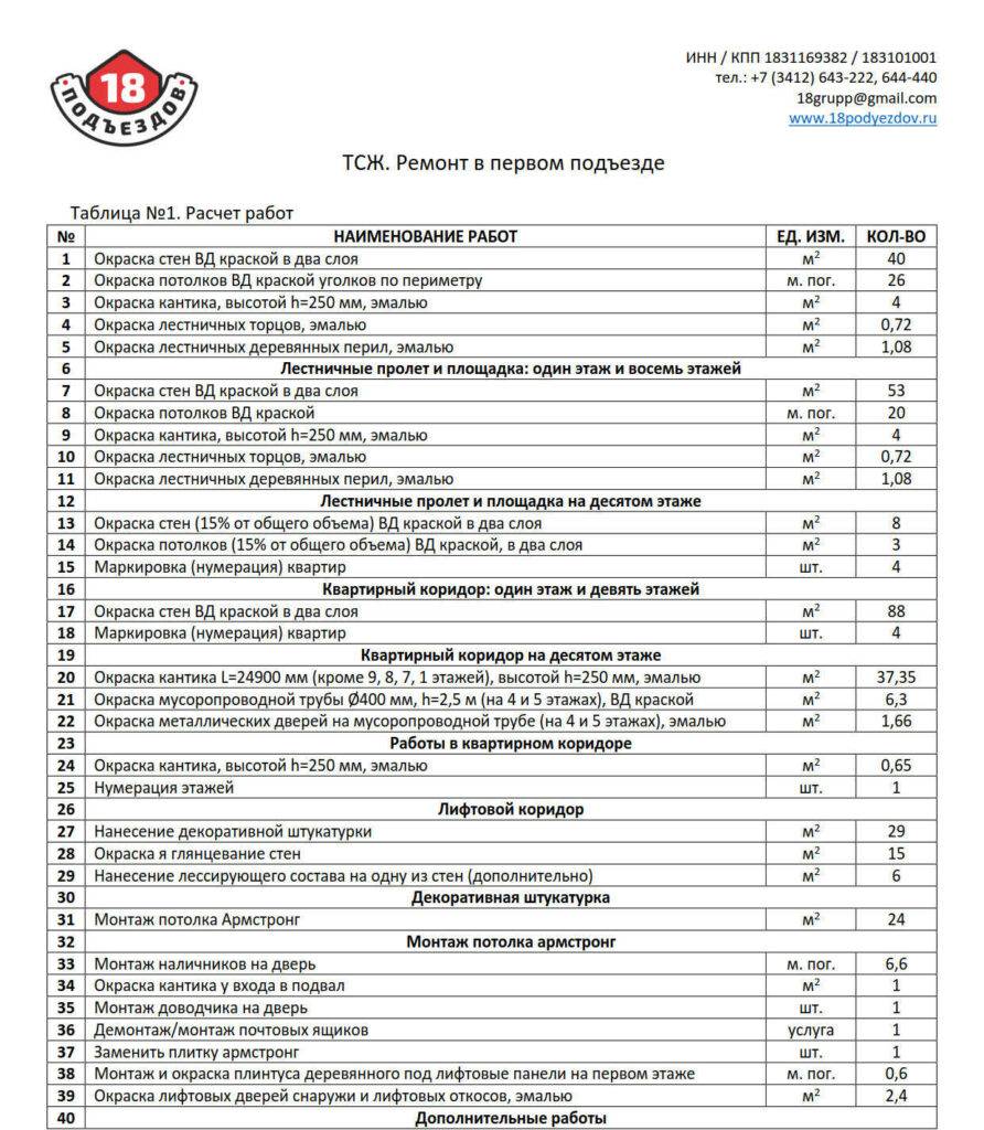 В нем прописаны предмет договора (косметический ремонт парадной), предусмотренный техзаданием или дефектной ведомостью и сметой объем работ, сроки выполнения задания. Обычно ремонт подъезда пятиэтажки успевают сделать за 10 рабочих дней. А согласно законодательству, максимальный срок проведения текущего ремонта – месяц.