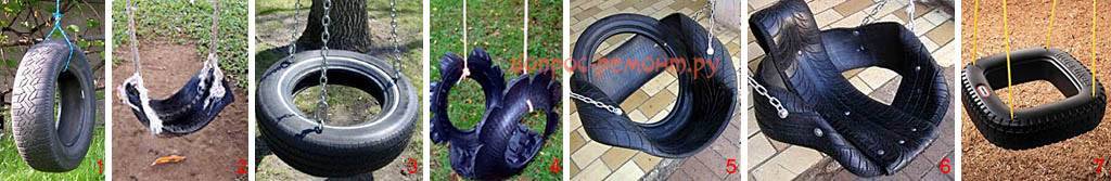 Наконец, из разрезанных и сложенных разными способами покрышек получаются одинарные качалки-кресла не только для детей, но и для взрослых, поз. 4-6. Популярность качелей из покрышек так велика, что некоторые спортивно-игрушечные и специализирующиеся на товарах для детей фирмы выпускают, специально для качелей… квадратные шины, поз. 7! Остается только воскликнуть вслед за автором «Тартарена из Тараскона»: «Слыхал ли кто-либо когда-то о чем-то подобном?»