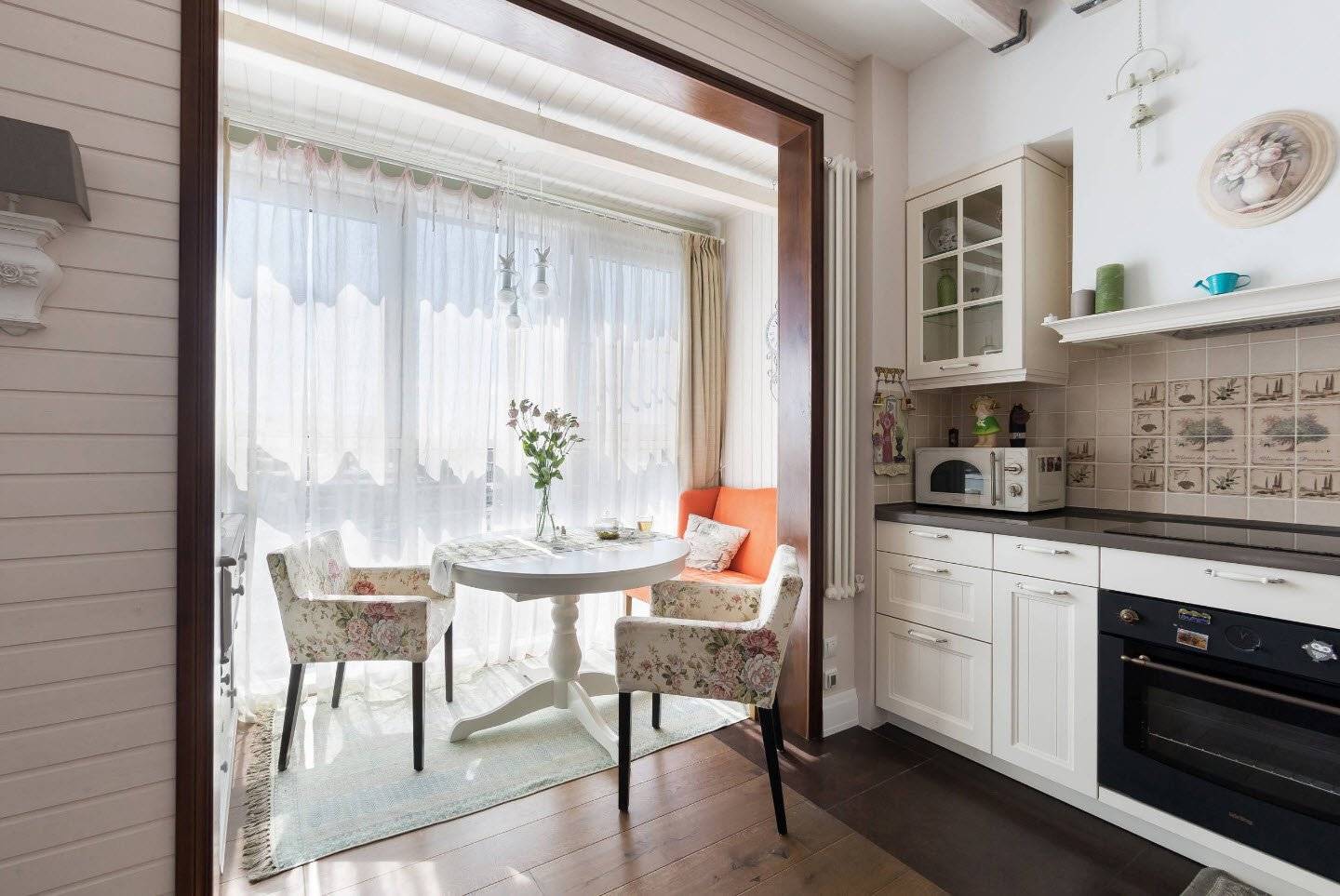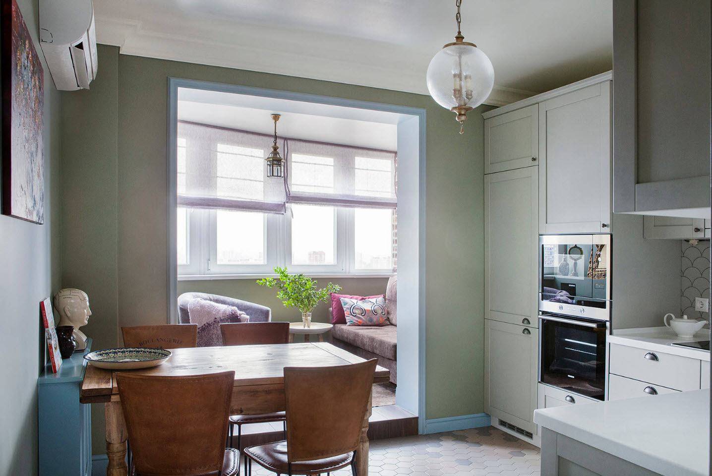 Если же лоджия примыкает к кухне, то её можно переоборудовать в зону приготовления пищи. Здесь можно расположить небольшую варочную панель, мойку или организовать вместительную систему хранения. Таким образом удается сэкономить достаточно свободного места, тем самым делая пространство более уютным.