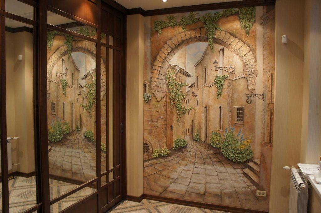 Для длинных и узких пространств используют трехмерные изображения водопадов, городских улиц или бескрайних полей. Освещение необходимо использовать точечное, настенное, желательны геометрические рисунки, расположенные поперек длины коридора.