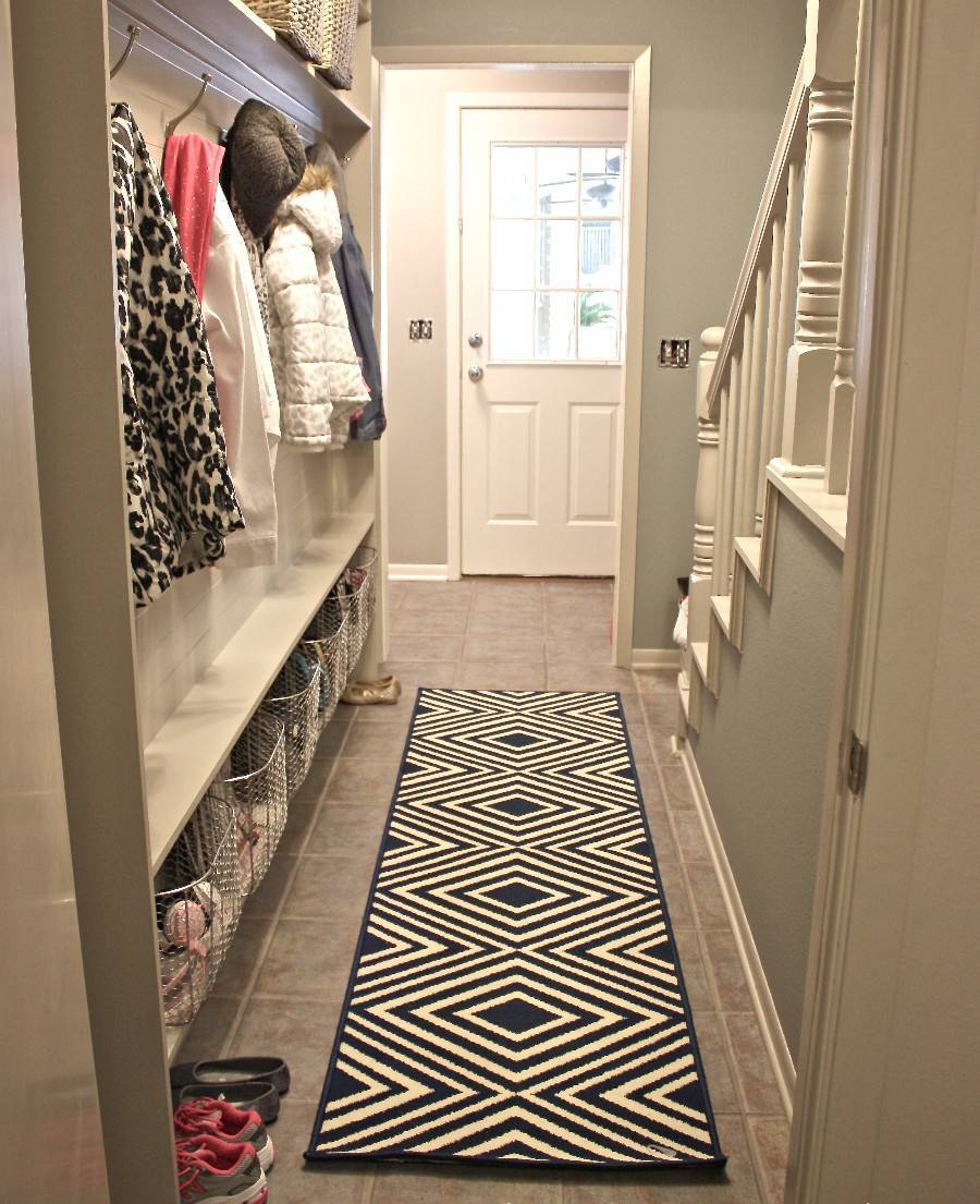 Часть пола у входа оформляется кафельной плиткой. Материал прост в уходе и четко дает понять о предназначении места. Дальше кафель сменит ламинат, покрытый широкой ковровой дорожкой или застеленный больших размеров ковром. Так будет символизировано начало проходной зоны.
