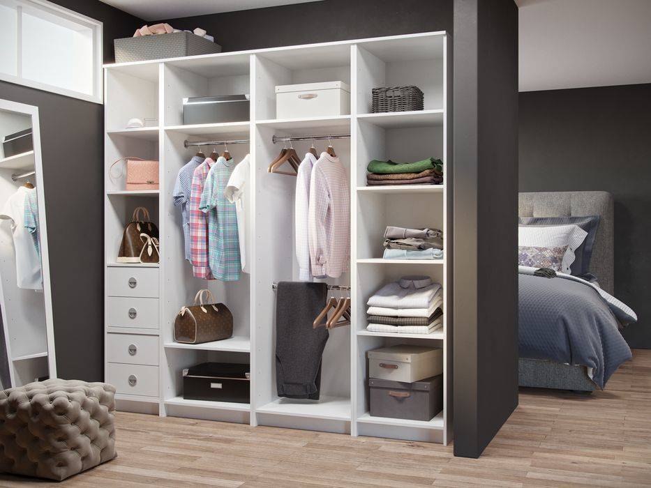 Это оптимальный вариант для квартиры с маленькой площадью, где невозможно для гардеробной выделить отдельную комнату. Как правило, используются металлические каркасы, в качестве наполнения выступают держатели для полок и стойки из алюминия. В верхней части располагают сами полки, посередине – вешалки, в нижней части – шкафчики.