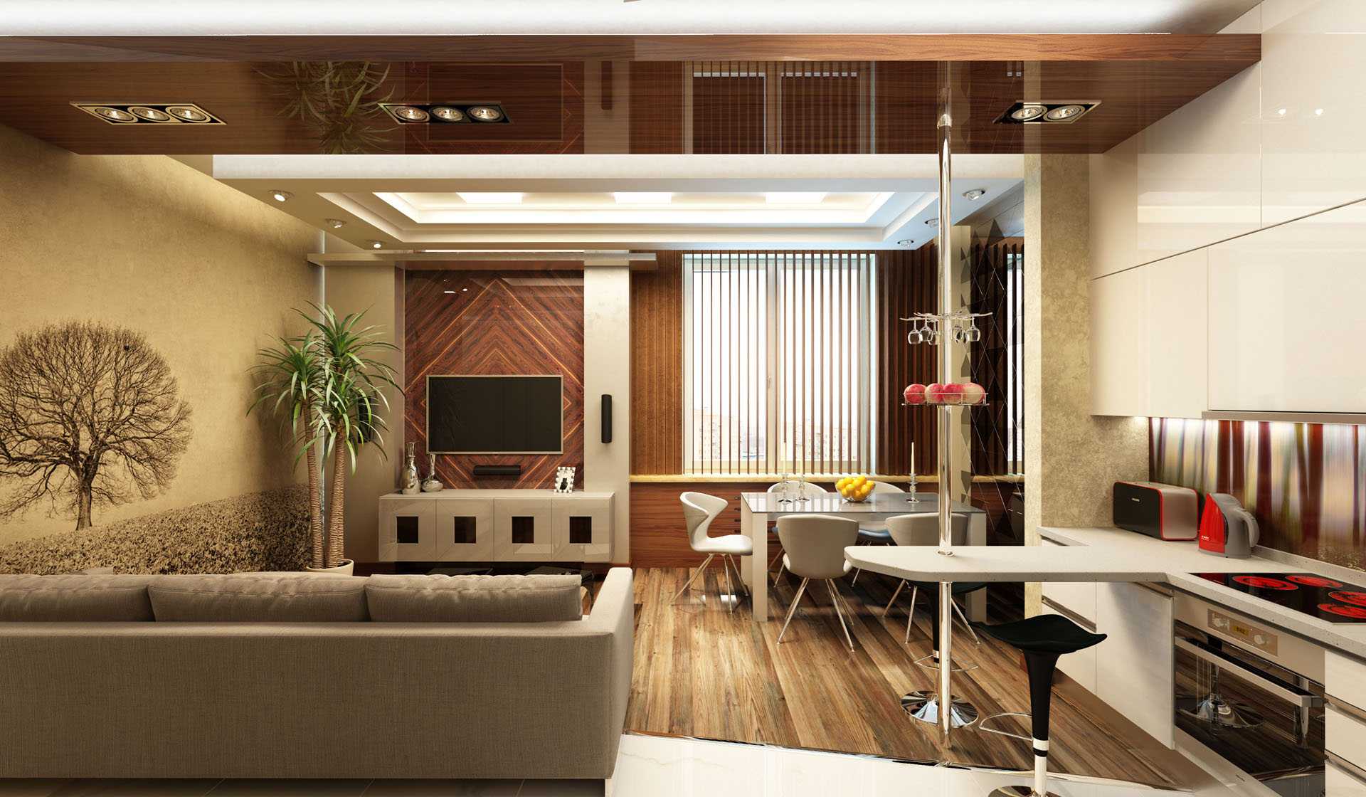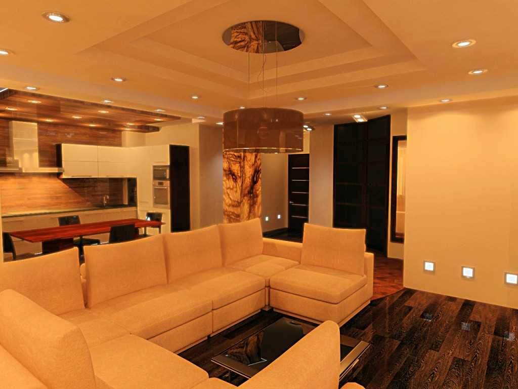 Подвесной потолок из гипсокартона дает возможность сделать разноуровневые конструкцию для дополнительного зонирования объединенного пространства. Другое преимущество – реализация интересных и сложных идей с освещением. Минус этого решения – потеря нескольких сантиментов высоты помещения.