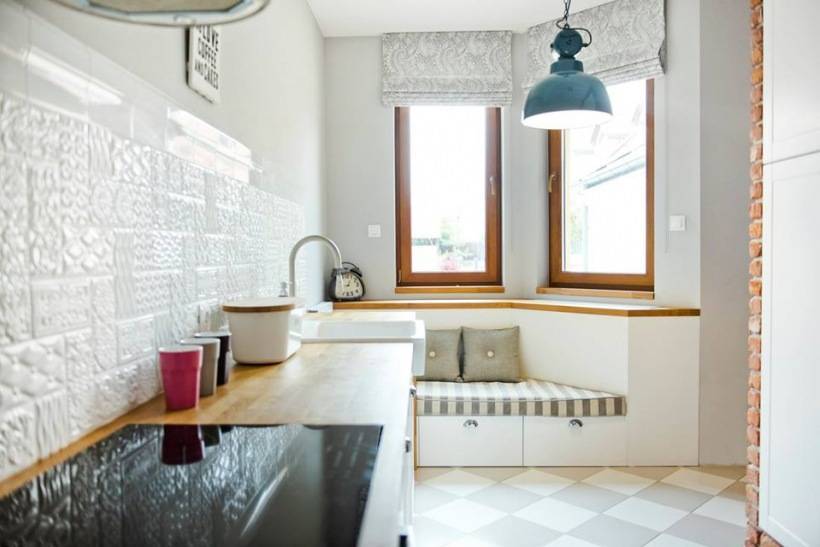 Особенно здорово смотрится столовая зона со скамьей, выстроенной вдоль окна. Скамья позволит сэкономить пространство, ведь в отличие от стульев она не требует запаса места за спинкой и может иметь под сидением встроенные ящики для хранения. Главное, чтобы окно и само помещение было хорошо утеплено и отапливаемо.
