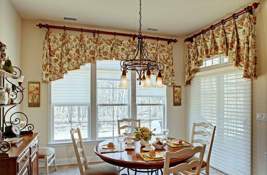 Выбор дизайна штор зависит от размера оконного проема и общего дизайна кухни. Популярные варианты: