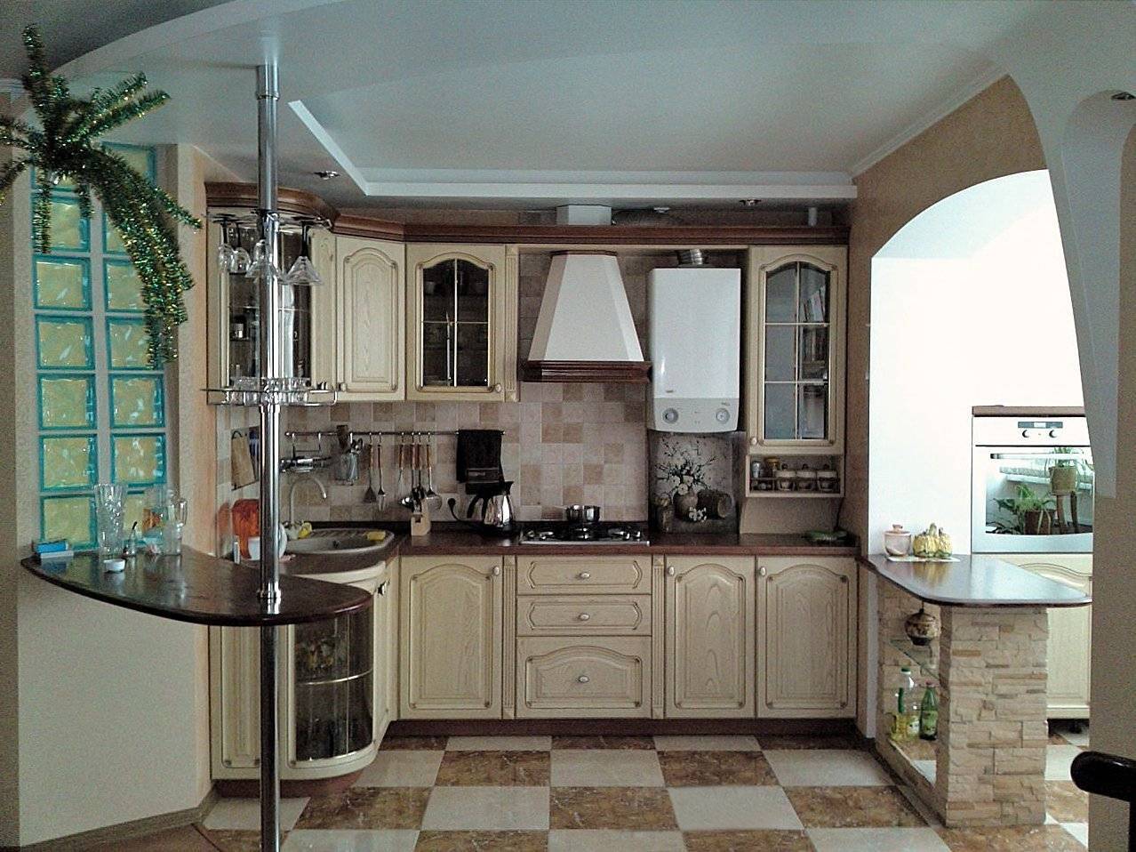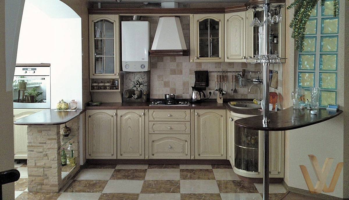 Подоконная часть выполняет роль барной стойки. Отделочные материалы: керамическая плитка, линолеум.