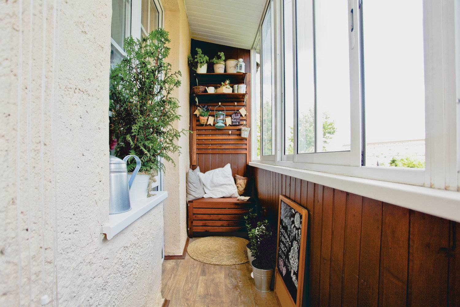 Чтобы не зависеть от погодных условий, лоджию стоит застеклить. Рамы могут быть из ПВХ или более экологичные — из дерева. Установив окна к ним стоит подобрать подходящие шторы или жалюзи.