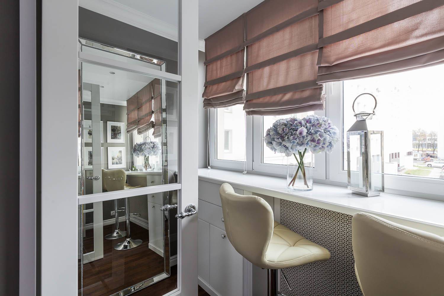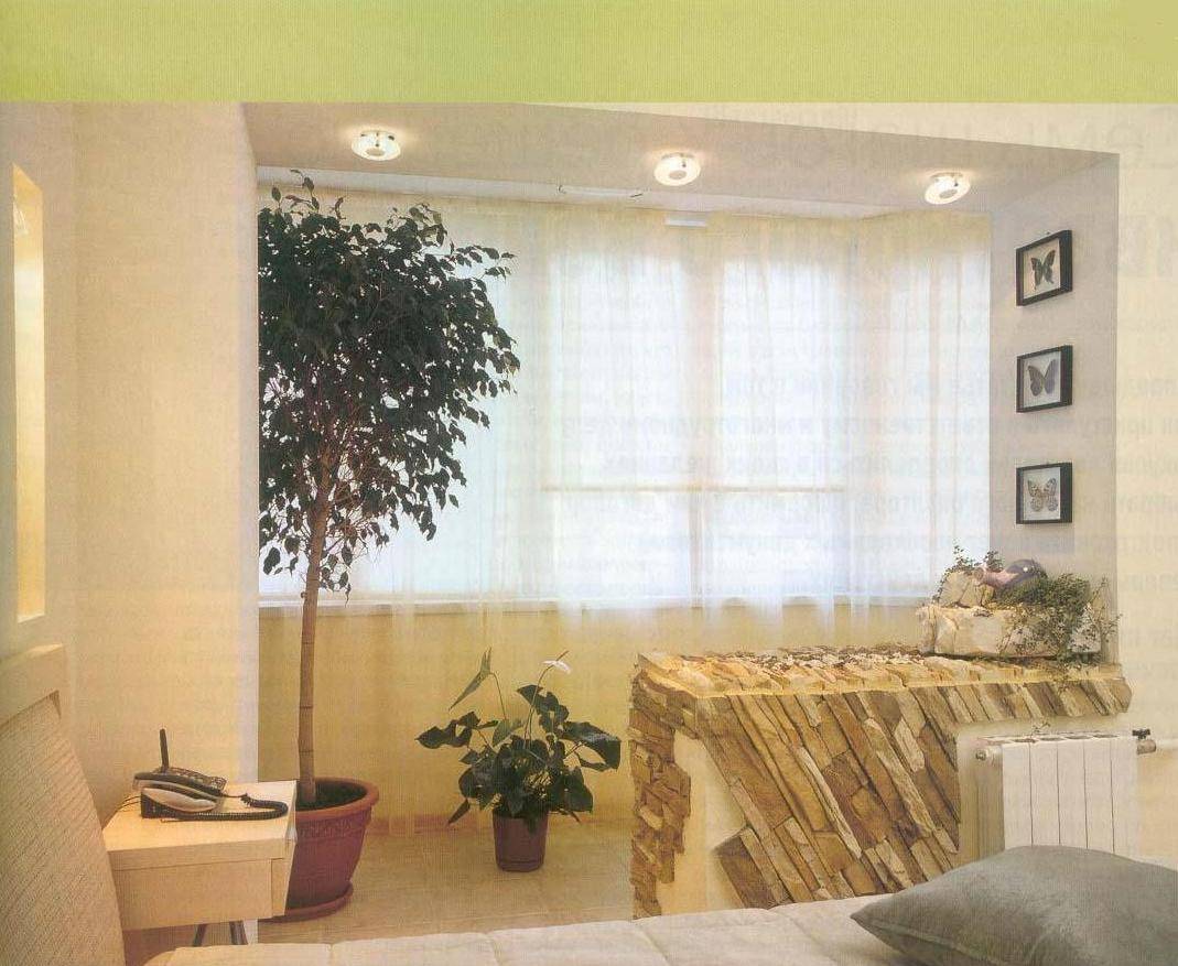Снимают балконную дверь, убирают окно, часть перегородки под подоконником. Образовавшуюся нишу используют как гардеробную или уголок для занятий. Если невозможно демонтировать железобетонный выступ, подоконник декоративно оформляют: превращают его в книжную полку, устанавливают разноуровневые подставки для цветов, делают стол или барную стойку.