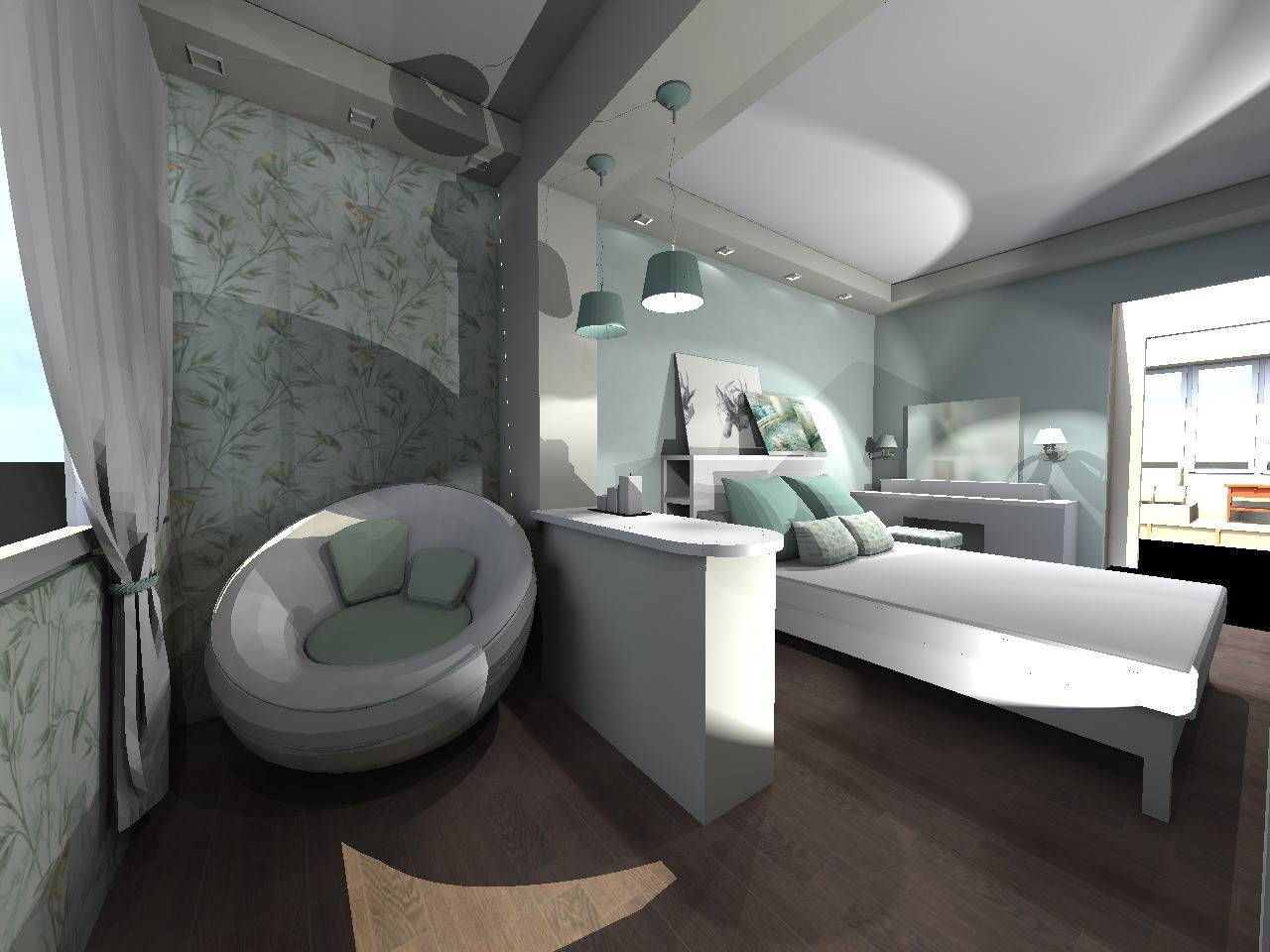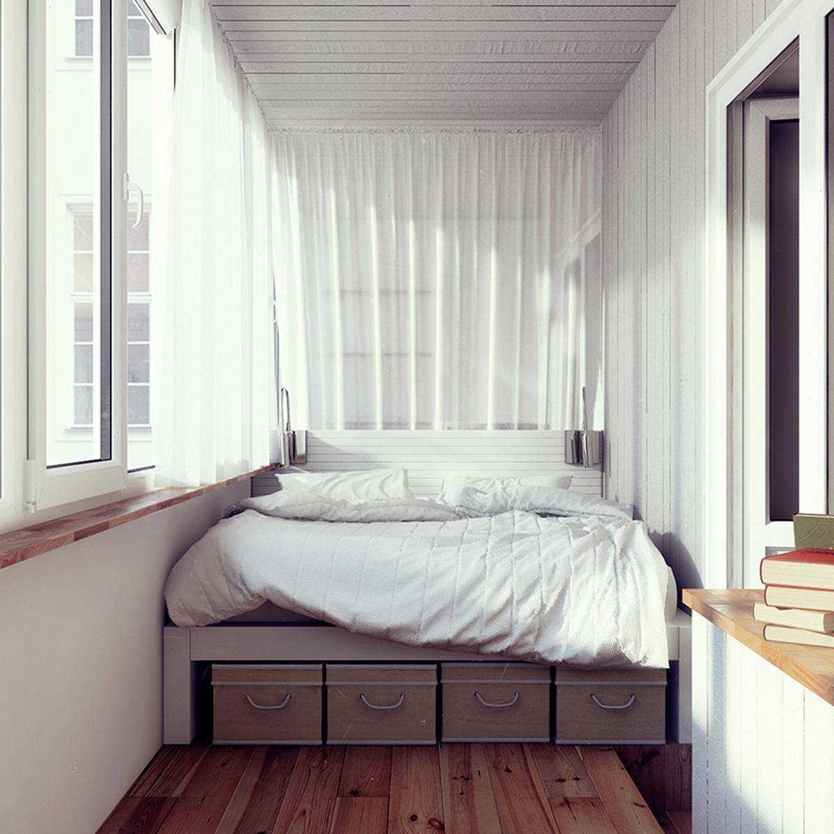 В таких решениях уместно избавиться от перегородки, разделяющей балкон и комнату, а спальное место разместить на возвышенном подиуме. Оградить кровать от основной зоны помогут декоративные шторы, ширмы, либо раздвижные двери.