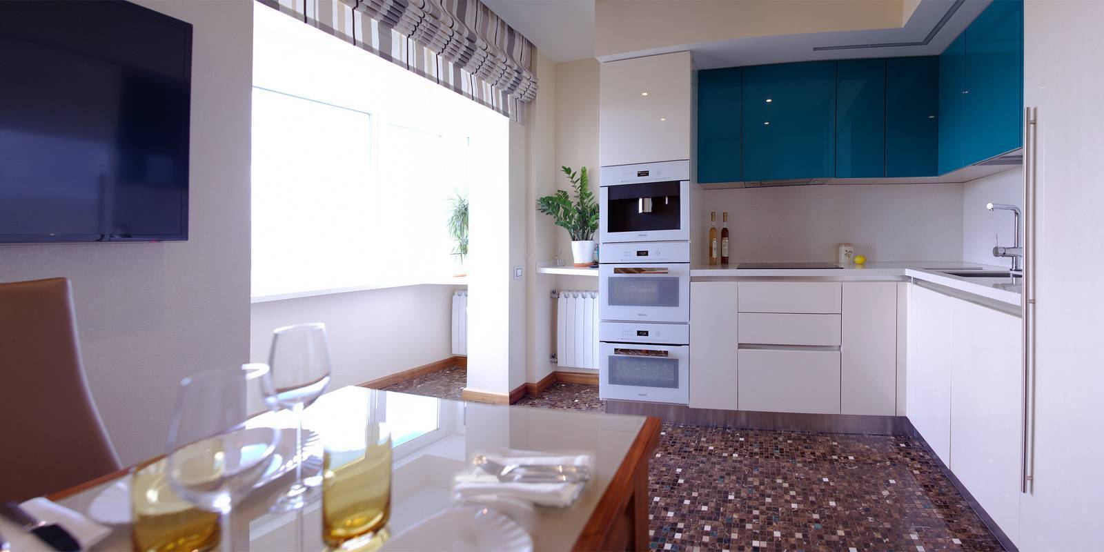 Далеко не всем необходима кухня, которая занимает много места. В пространстве утепленного балкона можно сделать кухню с компактным гарнитуром, обеденной зоной, варочной поверхностью домино, кофемашиной или микроволновкой.
