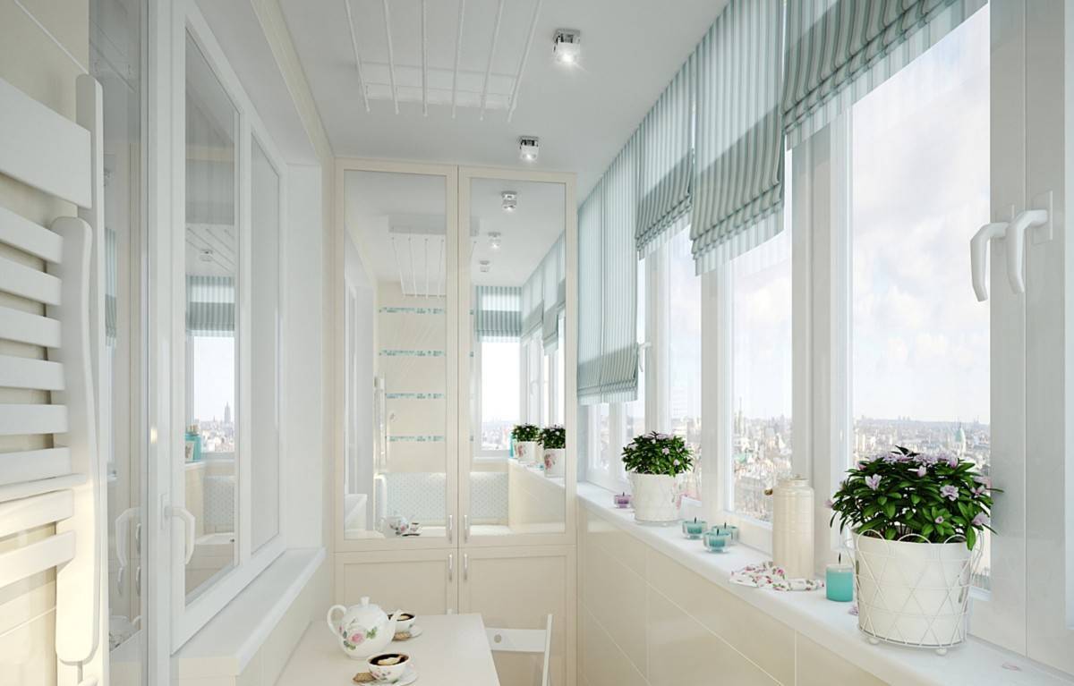 Стены, потолок окрашивайте светлыми тонами. И совершенно не обязательно использовать именно белый, очень нежно будет смотреться легкий розовый, бежевый или голубой оттенок. Просмотрите на фото дизайн отделки лоджий.