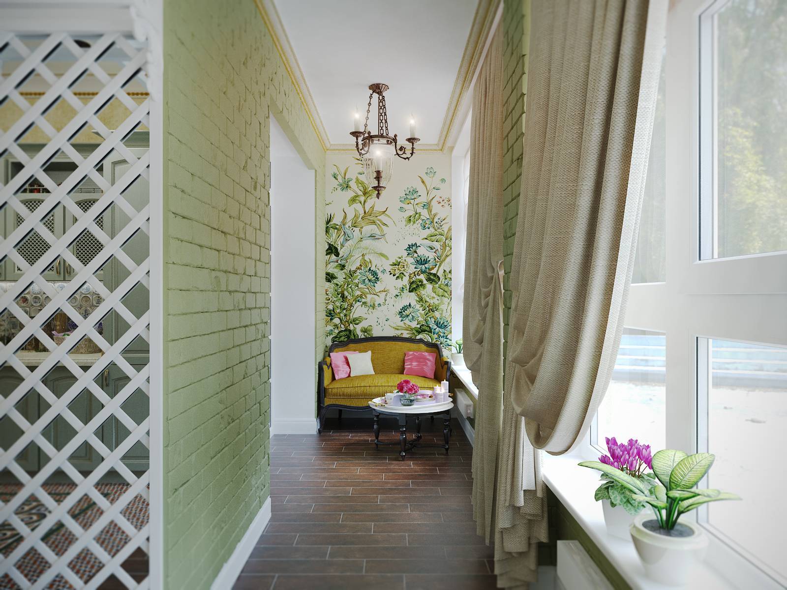 Дизайн лоджии предполагает шторы, светильники. Туда можно поставить удобное кресло или мягкий пуфик