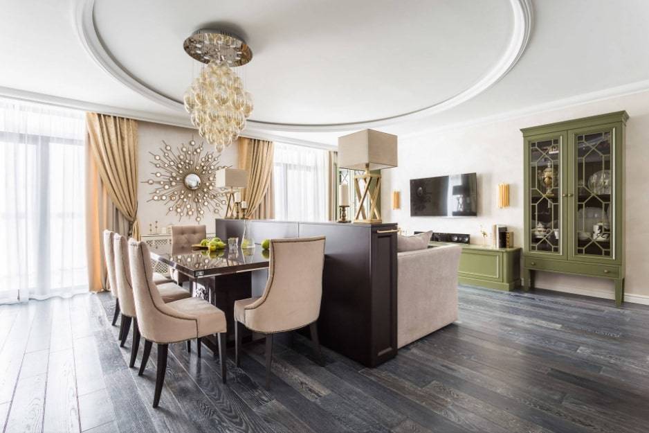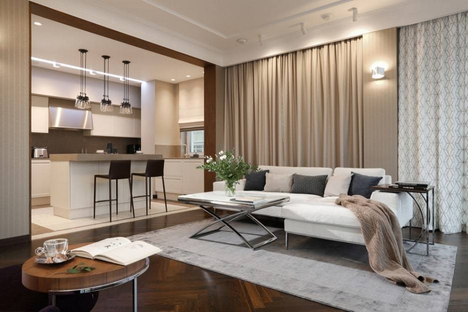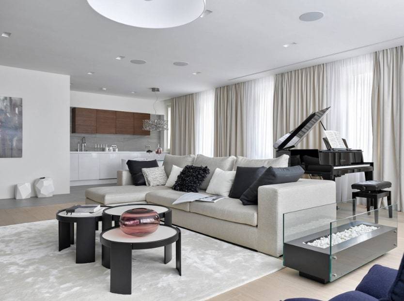 Отличным решением в 2021 году будут шторы в потолочной нише. Такой прием используют все чаще в стильных, современных интерьерах. Интересно, что при этом занавески могут быть не только плотными, но и тонкими, практически невесомыми. В зависимости от выбранного варианта, гостиная будет смотреться совершенно по-разному.