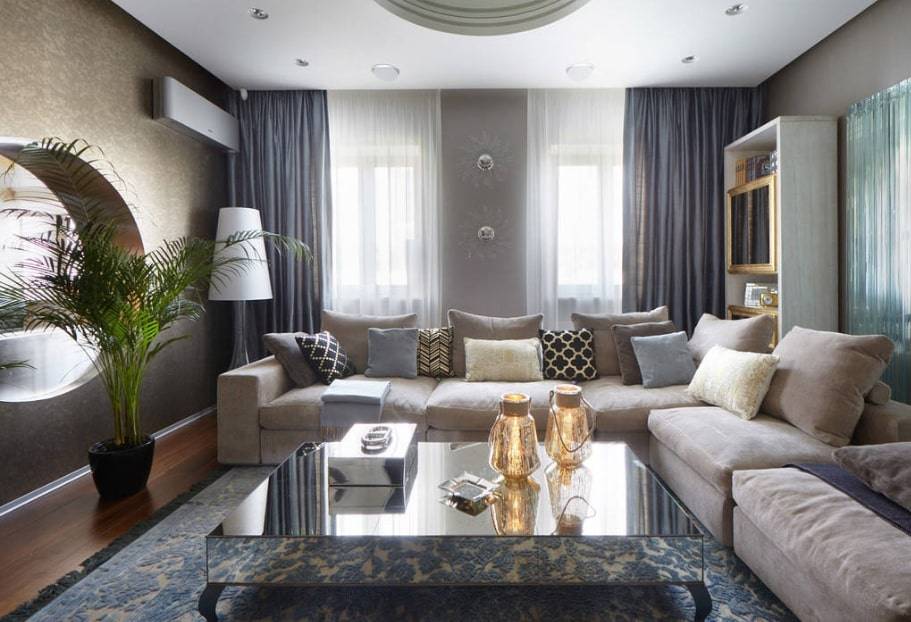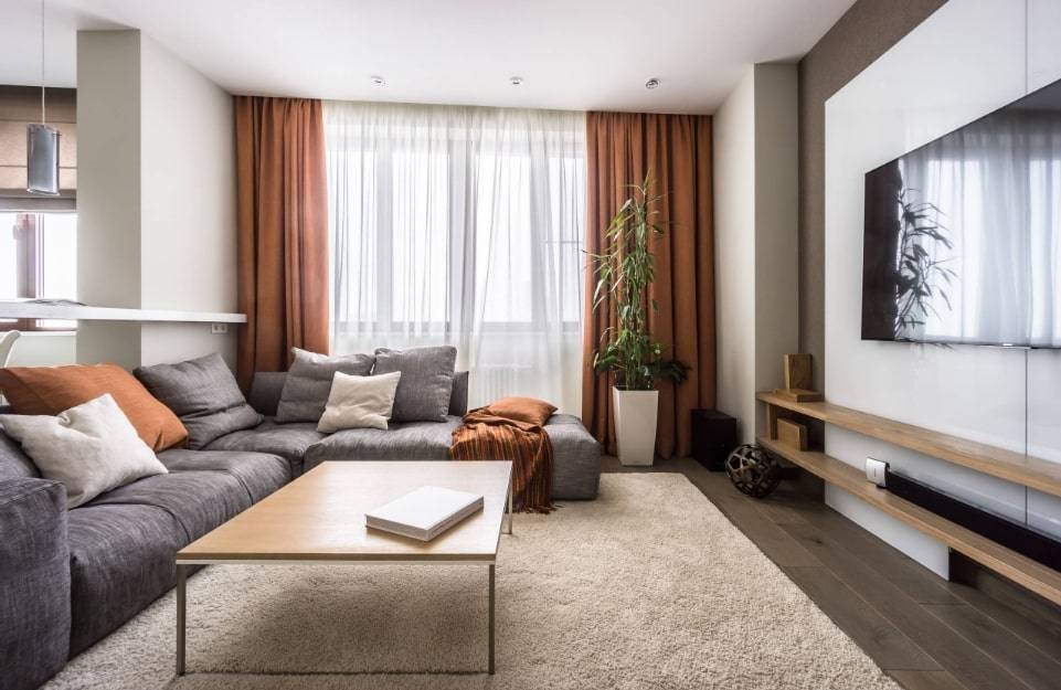 Занавески в зал в современном стиле могут быть сшиты как из натуральной, так и из синтетической ткани.