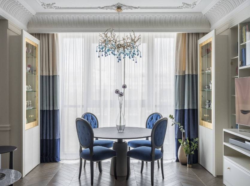 Занавеси могут доминировать или играть роль фона, дополняя общую стилизацию.