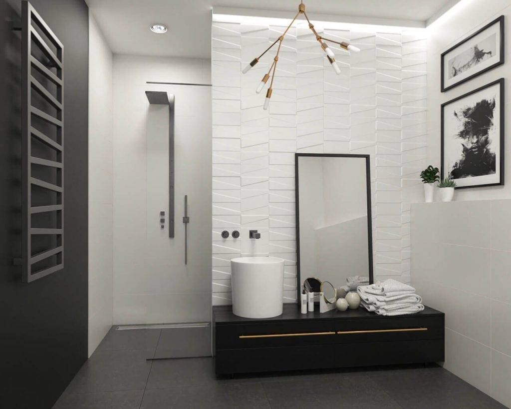 Красиво и необычно смотрятся рельефные панели, но чистить их сложно, в дизайне ванной их редко можно увидеть.