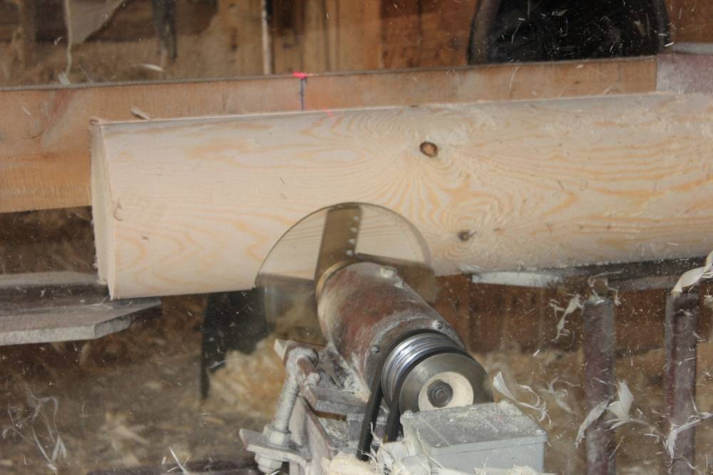 После оцилиндровки бревна разрезают на части для дома с помощью специальных пил (дисковых и цепных). Потом в них нарезают продольные пазы и «чашки» для удобства монтажа, устойчивости конструкции и изоляции тепла. Далее пиломатериал покрывается антисептиками, защищающими древесину от синевы, плесени и грибка.